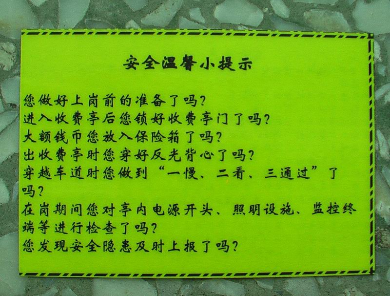 該站首先召開(kāi)了專(zhuān)題會(huì),精心組織,周密安排,營(yíng)造濃厚的“安全生產(chǎn)月”活動(dòng)氛圍;其次是形式多樣,務(wù)求實(shí)效。利用安全知識(shí)、安全提示卡、安全知識(shí)小測(cè)試等形式,普及安全生產(chǎn)常識(shí)。三是做好安全生產(chǎn)隱患自查自改工作。站安全領(lǐng)導(dǎo)小組集中對(duì)站內(nèi)的收費(fèi)、監(jiān)控、機(jī)電設(shè)施等重點(diǎn)區(qū)域進(jìn)行了安全排查,針對(duì)發(fā)現(xiàn)的問(wèn)題進(jìn)行了整改。四是深化班組長(zhǎng)在崗期間安全生產(chǎn)負(fù)責(zé)制。實(shí)施班組安全檢查制,每天由班組負(fù)責(zé)上崗期間收費(fèi)亭、收費(fèi)廣場(chǎng)的安全檢查,填寫(xiě)《班組安全檢查記錄表》,做到了安全工作與業(yè)務(wù)工作的有效結(jié)合。( 110國(guó)道沙城收費(fèi)站 王輝)
